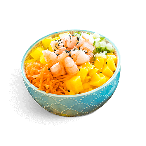 Basis van rijst, sla of een mix. Met garnalen, mango, wortel, rettich, komkommer, lente ui, geraspte kokos, sesam mix en sesamdressing. Bij de large poke krijgt u rode ui